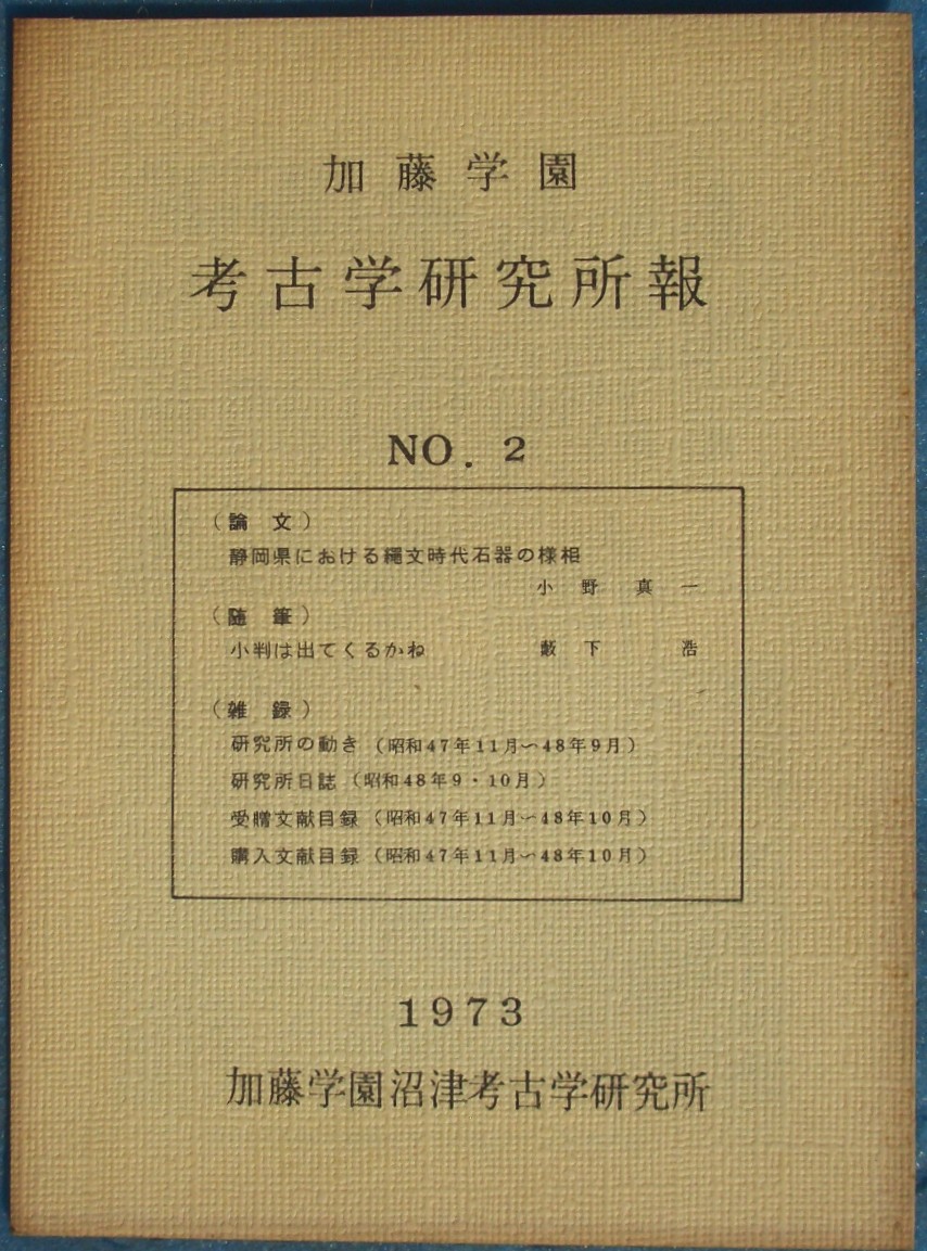 | 加藤学園 考古学研究所報 2号 (1973年) 静岡県 加藤学園沼生考古学研究所 | A5判、21ページ、端少ヤケ | 静岡県における縄文時代石器の様相 ほか | 加藤学園沼津考古学研究所 | 昭和48年 | \500 |