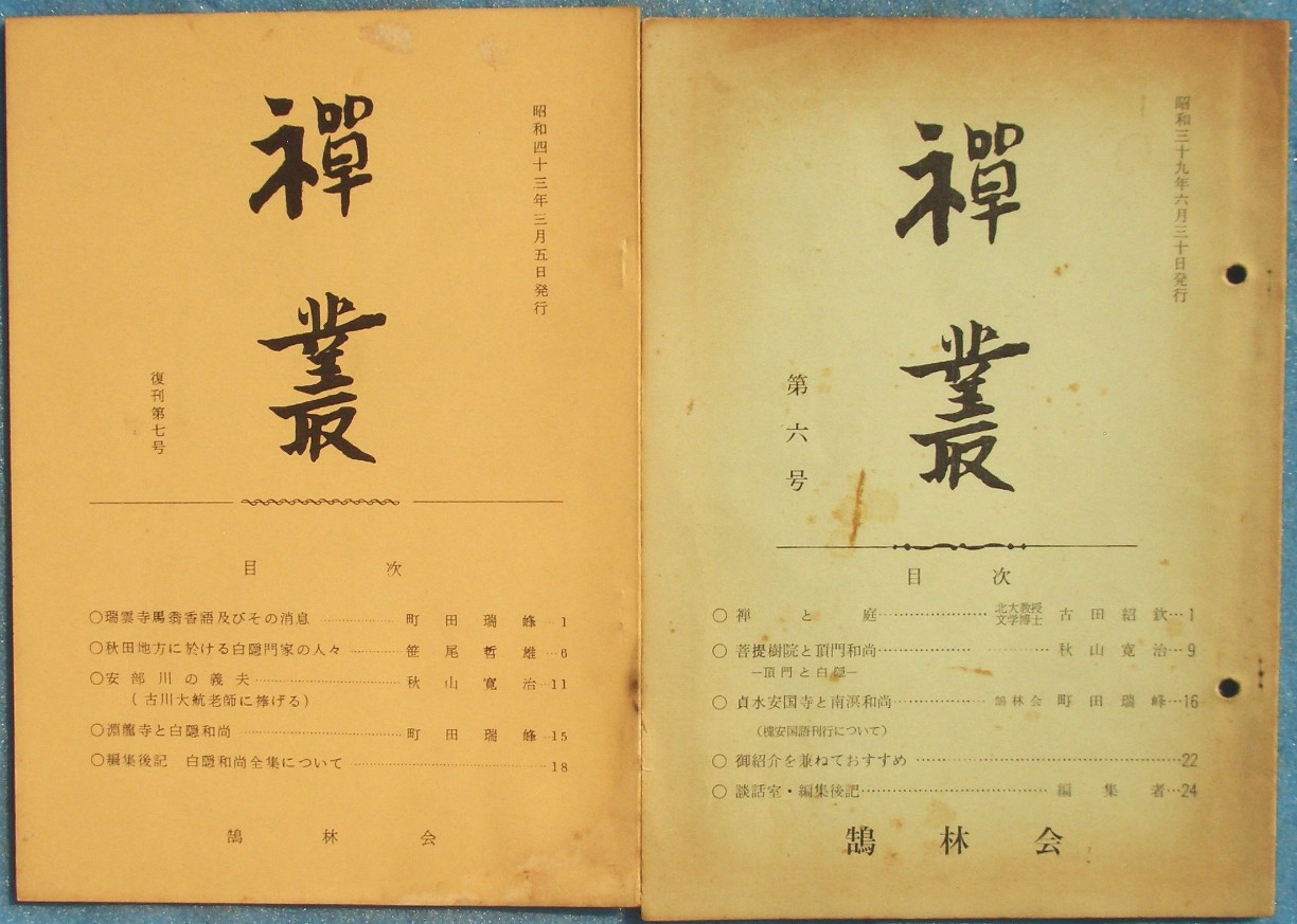 | 禅叢 6号・復刊7号 二冊 (昭和39年6月・昭和43年3月) 静岡県原町・鵠林会(白隠研究) | A5判、26・20ページ、パンチ穴、表紙汚 | 鵠林会 | 昭和39・43年 | \800 | |