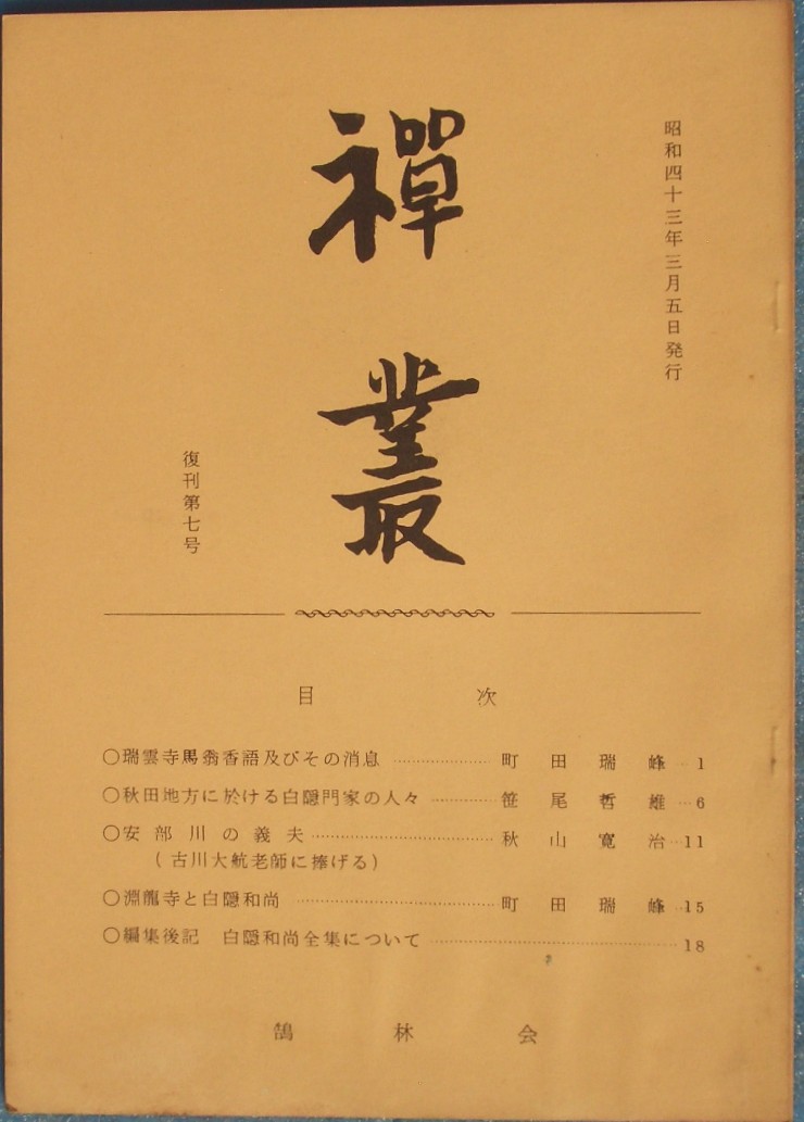 | 禅叢 復刊7号 (昭和43年3月5日号) 静岡県原町(現沼津市)・鵠林会(白隠研究) | A5判、20ページ、背・小口ヤケ、裏表紙少汚 | 鵠林会 | 昭和43年 | \400 | |