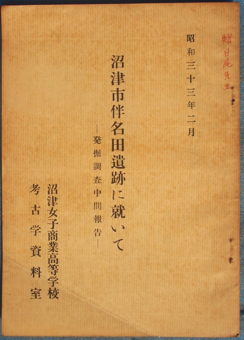 | 沼津市伴名田遺跡に就いて 発掘調査中間報告 | A5判、25ページ、表紙折、端ヤケ汚、小口ヤケ大、表紙少書 | 沼津女子商業高等学校考古学資料室 | 昭和33年2月 | \1,000 | |