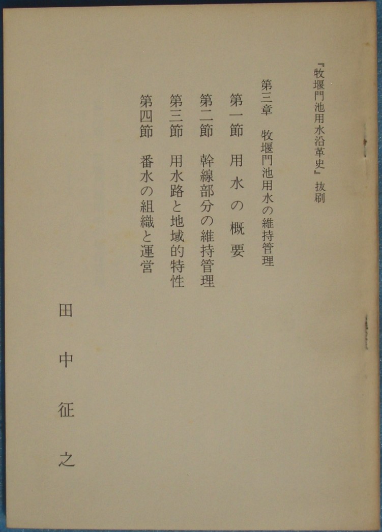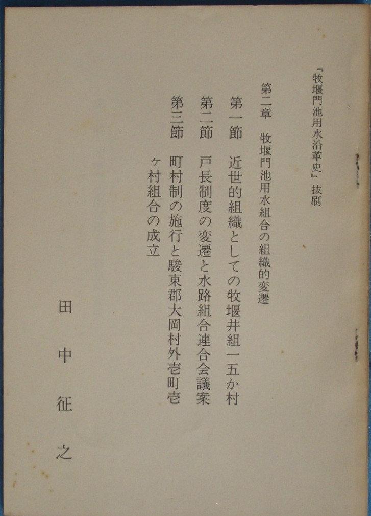 | 第二章・牧堰門池用水組合の組織的変遷 牧堰門池用水沿革史抜刷 (静岡県沼津市門池用水) | A5判、65ページ、背ヤケ傷、小口少ヤケ | 田中征之 | \600 | ||