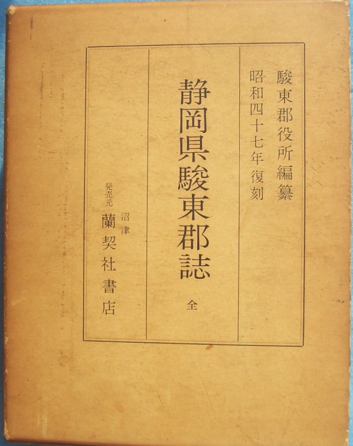 | 静岡県駿東郡誌 復刻版 長倉書店・蘭契社書店 | A5判、厚冊、函ヤケ汚、付図、大正5年の復刻版、小口少ヤケ | 駿東郡役所編纂 | 長倉書店発行、蘭契社書店発売 | 昭和47年 | \7,000 |