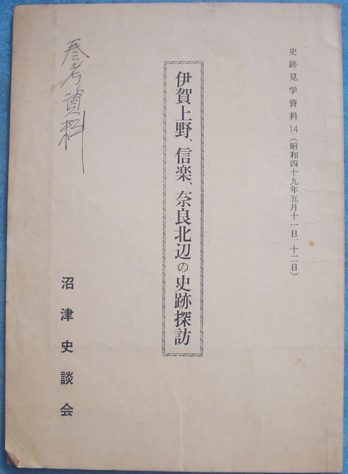 | 伊賀上野・信楽・奈良北辺の史跡探訪 沼津史談会史跡見学資料14 | B5判、14ページ、端痛、少書少汚 | 沼津史談会 | 昭和49年 | \400 | |