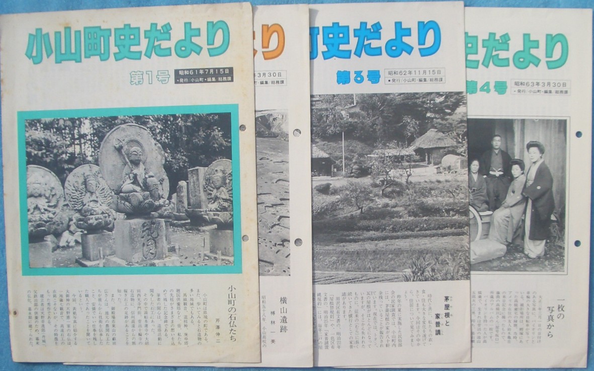 | 小山町史だより 1〜4号 四冊 昭和61年〜63年 静岡県駿東郡小山町刊 | B5判、各6ページ、パンチ穴、少汚 | 静岡県駿東郡小山町発行 | 昭和61〜63年 | \1,500 | |