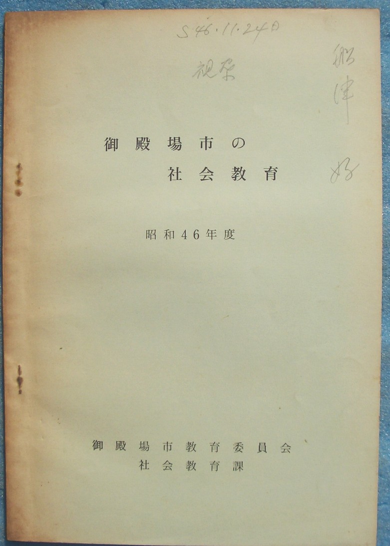 | 御殿場市の社会教育 昭和46年度 (静岡県) 御殿場市教育委員会社会教育課 | B5判、32ページ、端汚、少錆、少書 | 御殿場市教育委員会社会教育課 | 昭和46年度 | \500 | |