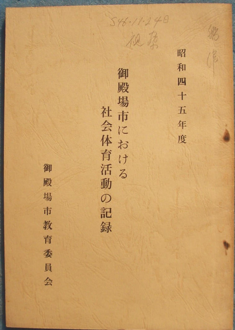 | 御殿場市における社会体育活動の記録 昭和45年度 静岡県・御殿場市教育委員会 | B5判、76ページ、表紙少書、背・小口ヤケ | 御殿場市教育委員会 | 昭和45年 | \1,000 | |