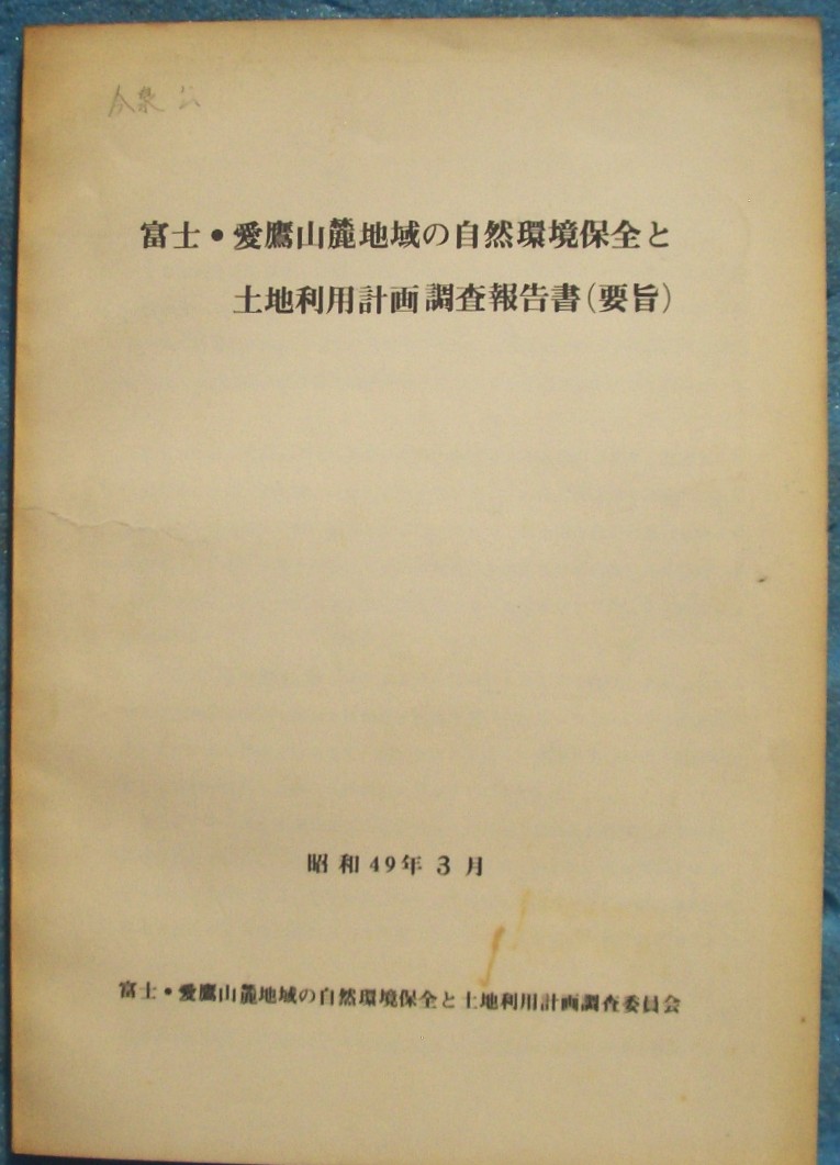 | 富士・愛鷹山麓地域の自然環境保全と土地利用計画調査報告書(要旨) 昭和49年3月 | B5判、83ページ、背・小口ヤケ | 富士・愛鷹山麓地域の自然環境保全と土地利用計画調査委員会 | 昭和49年 | \1,000 | |