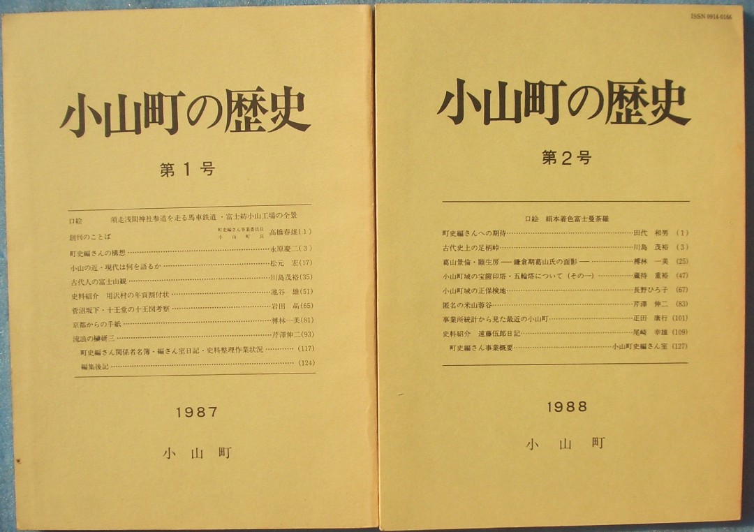 | 小山町の歴史 1・2号 二冊 静岡県駿東郡小山町役場 | B5判、124・130ページ、背少ヤケ | 静岡県駿東郡小山町役場 | 昭和62・63年 | \2,000 | |