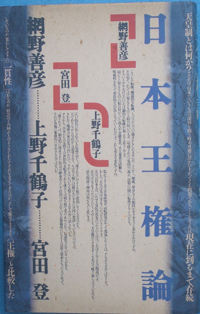 | 日本王権論 | A5変型判ハードカバー、カバー背少ヤケ・端少痛 | 網野善彦、上野千鶴子、宮田登 | 春秋社 | 1988年3刷 | 売切 |