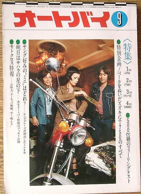 | オートバイ 37巻9号 1971年9月号 | 表紙角少折、裏表紙少シワ | 特集 500cc級のフィーリングテスト メグロ・T500・マッハV・CB500、ベールをぬいだスズキGT750のすべて | モーターマガジン社 | 昭和46 | 売切 |
